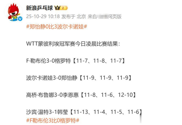 陈幸同作为本次冠军赛的头号种子选手,任谁也没想到,她竟被90后,“名不见经传”的罗马尼亚老将斯佐科斯直落3盘横扫了,就此“吃了个鸭蛋”,尤其在第3局,陈幸同更是以悬殊比分惨败,令人大跌眼镜。