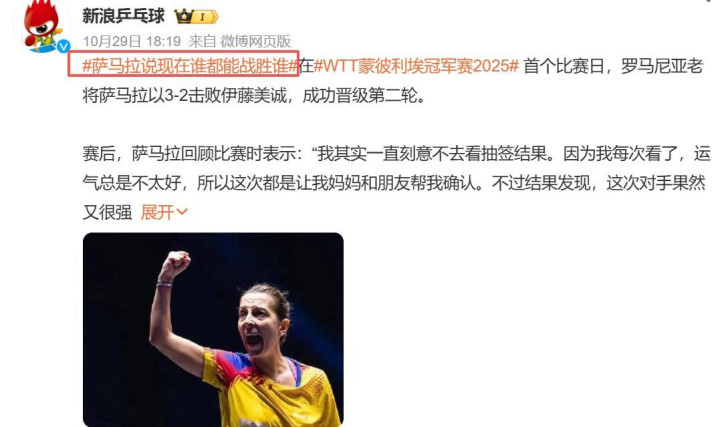 日本主力伊藤美诚也没摆脱“魔咒”,她在对阵罗马尼亚30多岁老将萨马拉时,眼看要赢了,却在决胜局遭遇“风云突变”,惨遭对手逆转,最终以2-3的比分出局。